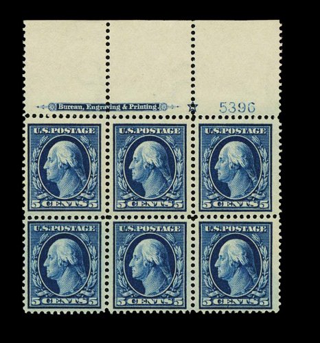 375 nhX 378 image#378, 5c Blue, handsome full top imprint, star and plate no. 5396 block of six, well centered (the top middle stamp is an absolute gem), deep color, o.g., n.h., choice very fine; 2002 PF certificate. (Image) 440.00