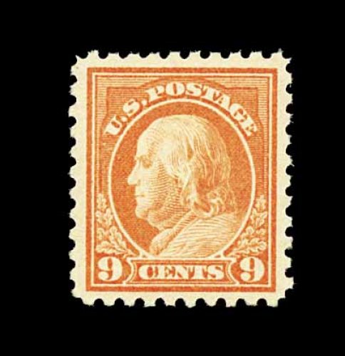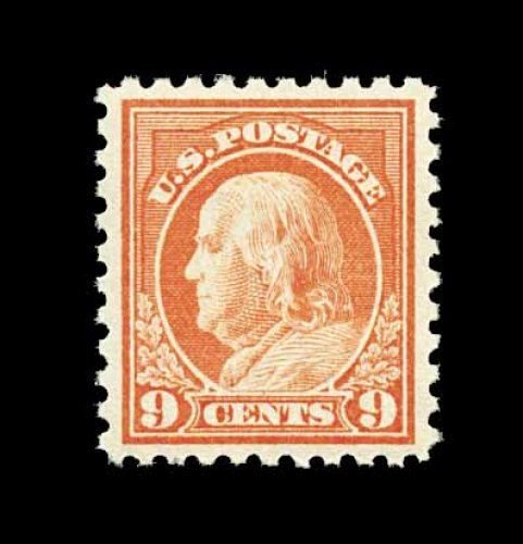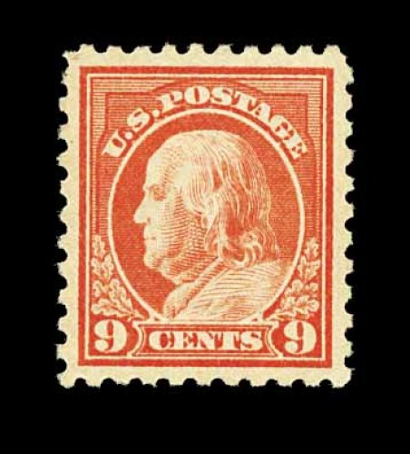 464 nh 471 image#471, 9c Salmon red, flawlessly centered within uncharacteristically large margins, strong rich color on bright paper, o.g., n.h., miniscule corner perf. crease at bottom right of no importance, extremely fine; clear 1980 PF certificate and a 2001 PF certificate. (Image) 110.00