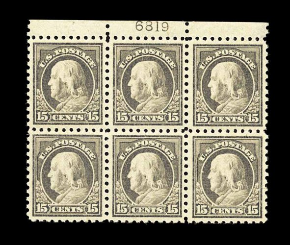 469 ogX 475 image#475, 15c Gray, top margin plate no. 6819 block of six, extraordinarily well centered for this rare plate block, rich color and a strong impression, o.g., four stamps n.h., rest lightly hinged, natural short selvage at top, very fine. (Image) 3,000.00