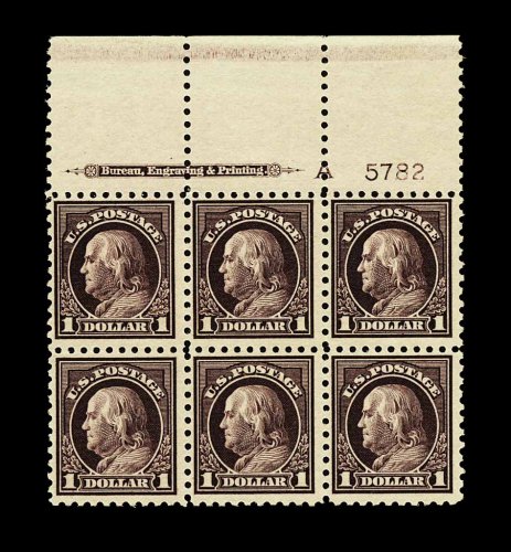 474 ogX 478 image#478, $1.00 Violet black, an exceedingly handsome full top margin imprint, letter "A" and plate no. 5782 block of six, in a quality which is seldom encountered on this plate block rarity, possessing an uncommon overall freshness, with stunning prooflike color and impression on bright paper, strong intact perforations all around, rather well centered, pristine o.g. without any of the gum bends or skips so often seen on these high value plate blocks, barest trace of hinging in the ungummed portion of the selvage and bottom center stamp only, others n.h., very fine and choice; much more rare than its 1915 watermarked counterpart; one of the few #478 full top plate blocks in existence; 1998 PF certificate. (Image) 13,000.00