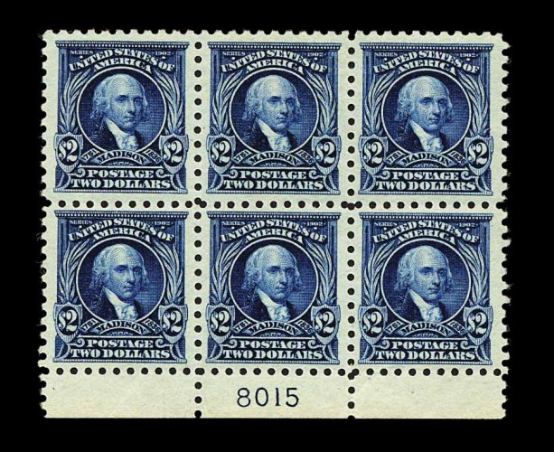 476 ogX 479 image#479, $2.00 Dark blue, bottom margin plate no. 8015 block of six, exceptionally well centered and margined throughout, deep rich color, o.g. which has just a couple of natural gum creases, center stamps lightly hinged, others n.h., choice very fine. (Image) 4,000.00