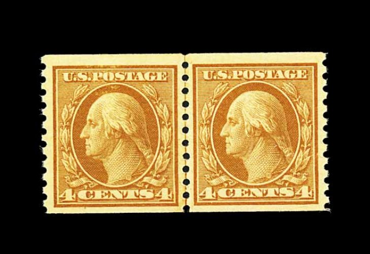 479 nh 495 image#495, 4c Orange brown coil, perf. 10 vert., joint line pair, extraordinarily well centered amid very large margins, fresh color, o.g., n.h., extremely fine; a gem line pair; 2002 PSE certificate for the line strip of four from which this came. (Image) 135.00