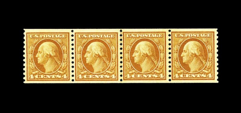 480 nh 495 image#495, 4c Orange brown coil, perf. 10 vert., guide line strip of four, lovely fresh color, nicely centered, o.g., n.h., very fine. (Image) 171.00+