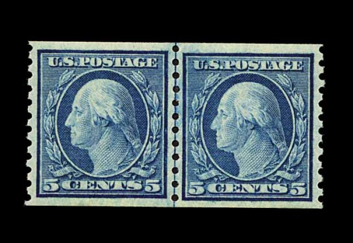 481 nh 496 image#496, 5c Blue coil, perf 10 vert., gem joint line pair, possessing absolutely perfect centering within large margins, prooflike color and impression, immaculate o.g., n.h., superb; a relatively available line pair in a most uncommon quality; 1999 PSE certificate. (Image) 55.00