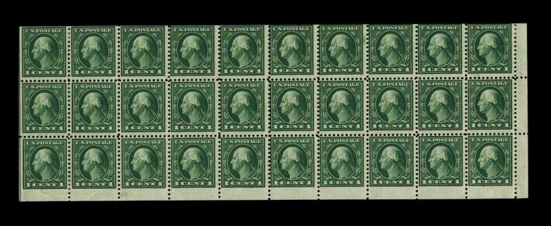 482 ogK 498f image#498f, 1c Green A.E.F. booklet pane of thirty, with guide line at left, deep color, o.g., hinged in the four corners, gum crease affects right two stamps in bottom row, faint trace of soiling at left of bottom margin, fine appearance; a presentable example of this very scarce booklet pane. (Image) 1,000.00
