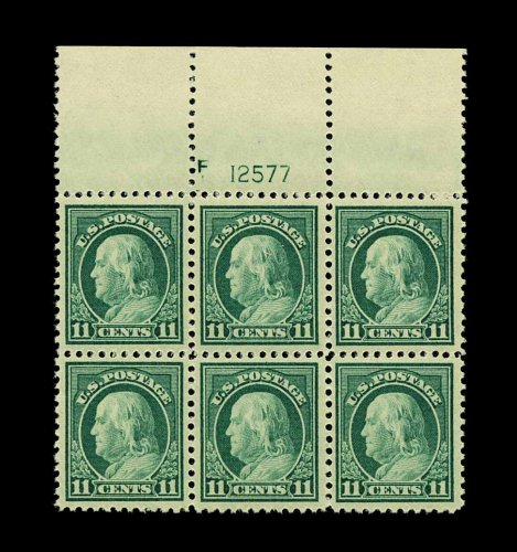 486 nhX 511 image#511, 11c Light green, a magnificent quality full top margin plate no. F12577 block of six, remarkably well centered and margined for a plate block, rich color, crisp and intact, unblemished o.g., n.h., extremely fine; a gem full top plate block; 2002 PF certificate. (Image) 200.00