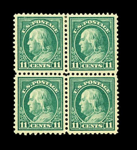 487 og/nhbl 511a image#511a, 11c Light green, perforated 10 at bottom, the lower left stamp in a mint block of four, being a magnificent and incomparable mint example of this rare variety, incredibly well centered, with strong fresh color and a crisp impression on bright paper, o.g., the three normal stamps with small hinge remnants, however the variety is never hinged, extremely fine; an extraordinary multiple which not only shows the transition from perf. 10 to perf. 11, but it also contains what is quite likely the finest example of this rare perforation variety in existence; 1982 PF certificate. (Image) 3,500.00+