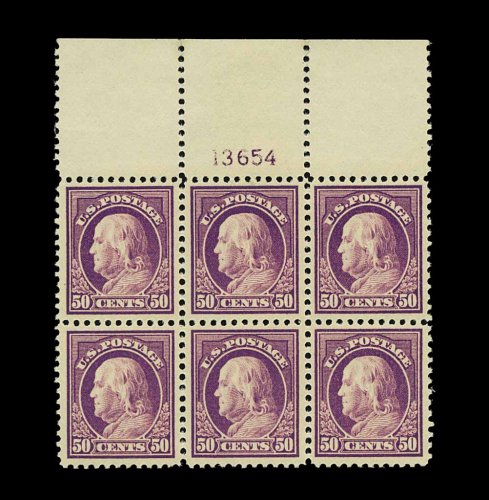 489 nhX 517 image#517, 50c Red violet, an extraordinary quality full top margin plate no. 13654 block of six, featuring an extra-large sheet selvage in addition to being marvelously fresh and crisp, wonderfully well centered and margined throughout, prooflike color and impression, pristine o.g. without a single gum bend or skip, n.h., extremely fine; an especially scarce and desirable plate block in this premium condition. (Image) 2,550.00