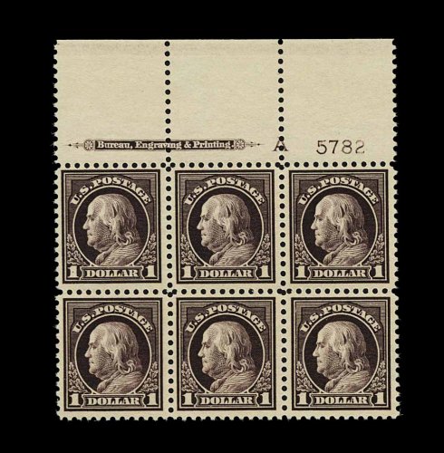 490 nhX 518 image#518, $1.00 Violet brown, an especially handsome full top margin imprint, letter "A" and plate no. 5782 block of six, being in a quality seldom encountered on this scarce plate block, possessing a marvelous overall freshness and crispness, with prooflike color and impression on bright paper, exceptionally well centered throughout, full unblemished o.g., n.h., very fine and exceedingly choice. (Image) 2,100.00