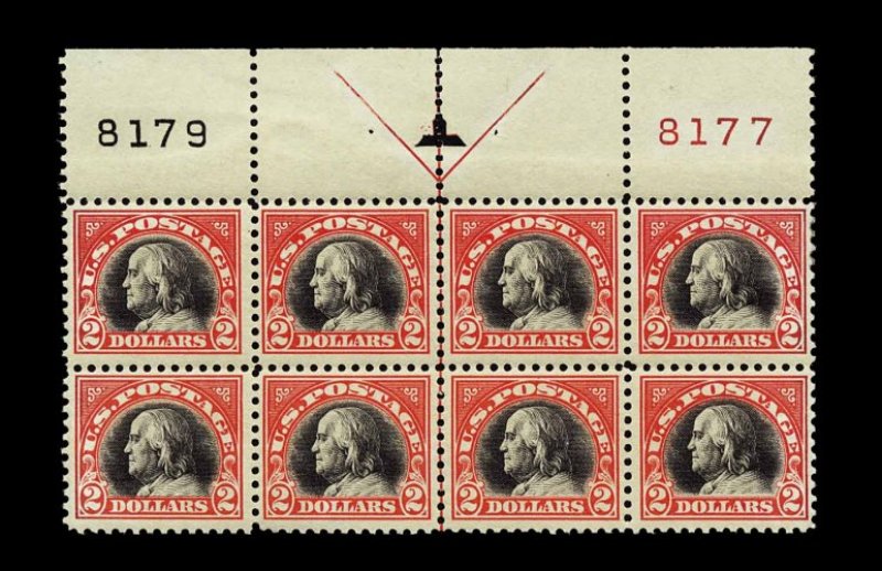 495 ogX 523 image#523, $2.00 Orange red and black, an impressive full top margin arrow and plate nos. 8179, 8177 block of eight, in a fabulous state of preservation for this immensely rare plate block, possessing outstanding overall freshness and brilliance, with gorgeous intense colors on bright paper, wonderfully well centered throughout, completely intact and strong perforations, pristine o.g., seven stamps never hinged, eighth stamp lightly hinged, certainly deserving of the extremely fine grade considering all of the exceptional physical attributes of this impressive plate block; unquestionably one of the finest available examples of this important 20th century plate block, of which it is believed that probably no more than a dozen exist; 1991 PSE certificate; ex-Weisman. (Image) 12,000.00
