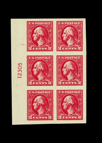 500 ogX 534B image#534B, 2c Carmine offset imperforate, Ty. VII, full left sheet margin plate no. 12305 block of six, possessing lavishly large margins all around, especially deep color and impression which shows the important Ty. VII characteristics well, full o.g., realtively lightly hinged, extremely fine; a choice example of one of the rarest of all 20th century plate number blocks; a plate block which is missing in even the most advanced collections; 1976 PF certificate. (Image) 17,000.00
