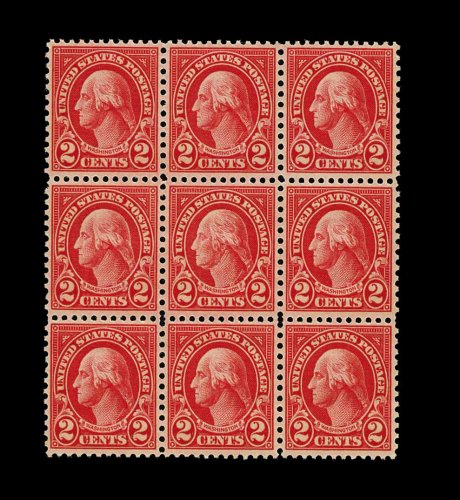 522 nhbl 634var. image#634 var., 2c Carmine, "long ear" recut variety, from position 34 in the top right sheet of plate #20342, the variety being the middle stamp in a block of nine, exceptionally well centered, strong fresh color, o.g., n.h., choice very fine; a seldom offered variety. (Image) for hinged 400.00