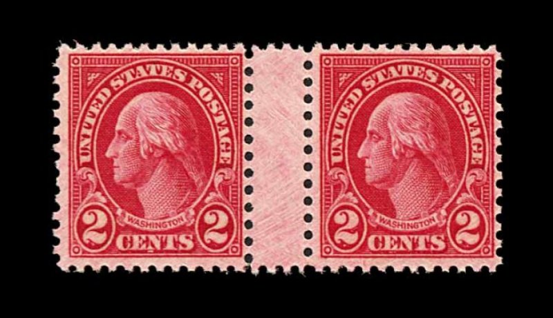 523 nh 634A var image#634A var., 2c Carmine, Ty. II, horizontal pair with vertical gutter between, deeply rich color, o.g., n.h., fine and scarce. (Image) for hinged 1,000.00