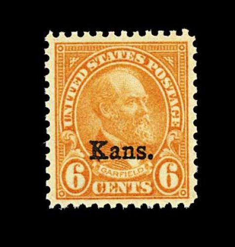 525 nh 664 image#664, 6c "Kans." ovpt., exceedingly well centered, bright color, o.g., n.h., extremely fine; a highly select example; 2002 PSE certificate for a block of ten, this being the bottom left stamp. (Image) 50.00