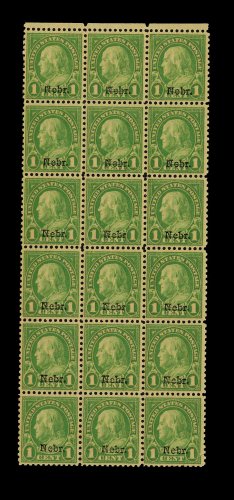 526 nhbl 669b image#669b, 1c "Nebr." ovpt., period omitted after "Nebr", two examples as the center vertical pair in a mint block of eighteen (positions 26 and 36 on the sheet), exceptionally well centered, strong color, o.g., all n.h. except four non-error stamps, bottom right stamp with damaged corner, otherwise very fine; a most unusual specialist's multiple, perfect for exhibition. (Image) 188.00+