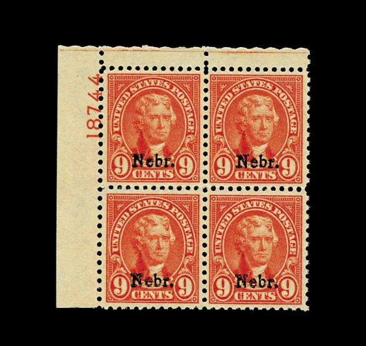527 nhX 678 image#678, 9c "Nebr.", top left corner plate no. 18744 block of four, marvelously well centered throughout the plate, fresh color, o.g., n.h., extremely fine; truly a rare plate block in this gem quality; 2002 PSE certificate for the plate block of eight from which this came. (Image) 700.00