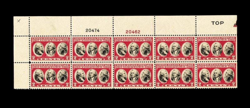 529 nhX 703b image#703b, 2c Yorktown, dark lake and black error of color, a showpiece top left corner margin "TOP" and plate nos. 20474, 20462 block of ten, being the two top rows from an error sheet, marvelously fresh, generally quite well centered, pristine o.g., n.h., fine-very fine; believed to be the largest plate number multiple known of this rare color error; 1980 and 1998 PF certificate; ex-Wampler. (Image) 6,600.00+