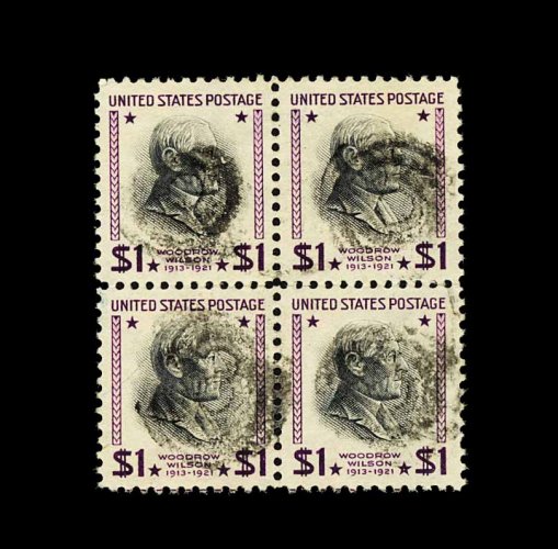 531 Obl 832b image#832b, $1.00 Purple and black, watermarked "USIR" in error, used block of four, excellent centering, strong color, extremely fine; unpriced as a used block, cataloged simply as four singles; ex-Twigg-Smith. (Image) 260.00+