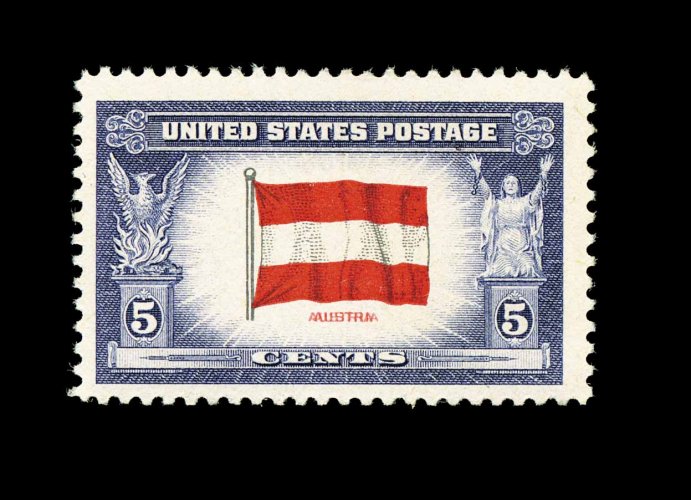 533 nh 919a image#919a, 5c "Austria" Overrun Nations, double impression of "Austria" inscription, o.g., n.h., very fine; only a tiny number are known; listed but unpriced in Scott; 2002 PF certificate. (Image) Est. 1,000-1,500