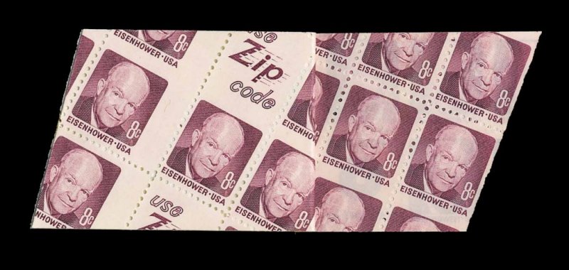 540 nhU 1395d var image#1395d var., 8c Eisenhower booklet pane of seven plus "Zip" label, radical miscut foldover resulting in five stamps being imperforate horizontally between the stamp and a portion of the adjoining stamp or label, contained in an unexploded booklet with normal panes, o.g., n.h., very fine; a most unusual booklet error. (Image) Est. 400-500