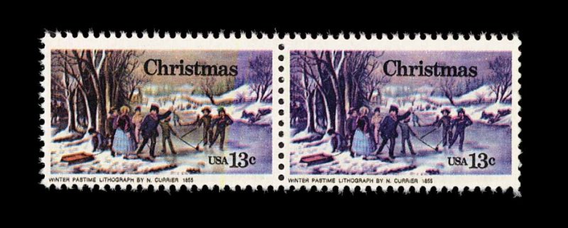 565 nh 1703e image#1703e, 13c Christmas, yellow omitted, the right stamp in a horizontal pair, the left stamp with yellow partially omitted, o.g., n.h., very fine; accompanied by a letter from the B.E.P. stating this error was caused by "ink starvation at the yellow station of the press"; listed but unpriced in Scott. (Image) Est. 200-300