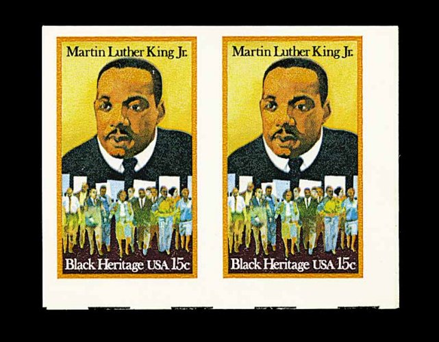 568 nh 1771a image#1771a, 15c Martin Luther King, imperforate, bottom right corner margin horizontal pair, large margins, o.g., n.h., extremely fine; only 10 pairs have been reported; listed but unpriced in Scott. (Image) Datz 1,750.00