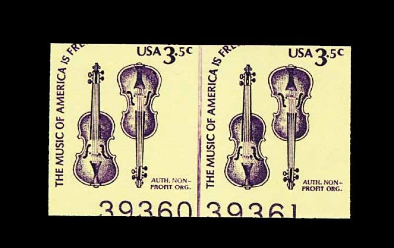 571 nh 1813b image#1813b, 3.5c Violins coil, imperforate, joint line pair, with nearly complete plate nos. 39360 and 39361 showing in the bottom margin, o.g., n.h., fine; quite possibly unique with the double plate numbers. (Image) 400.00+