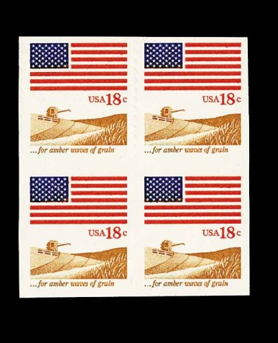 574 nhbl 1890b image#1890b, 18c Flag and Grain, vertical pair, imperforate horizontally, block of four containing two such pairs, with blind vertical perforations as always, o.g., n.h., very fine; only 10-15 total pairs reported, therefore blocks are extremely rare; 1987 PF certificate for the block of ten from which this came. (Image) 1,700.00+
