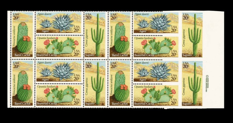 577 nhbl 1945c image#1945c, 20c Desert Plants, se-tenant block, right stamp imperforate, vertical pair from the bottom two rows of the unique pane which produced this unusual error, with the stamps to the left of the errors being partially perforated horizontally; only two such pairs and one single exist; the Datz price of $6,600.00 is based on the last recorded auction sale in 1996. (Image) 5,250.00