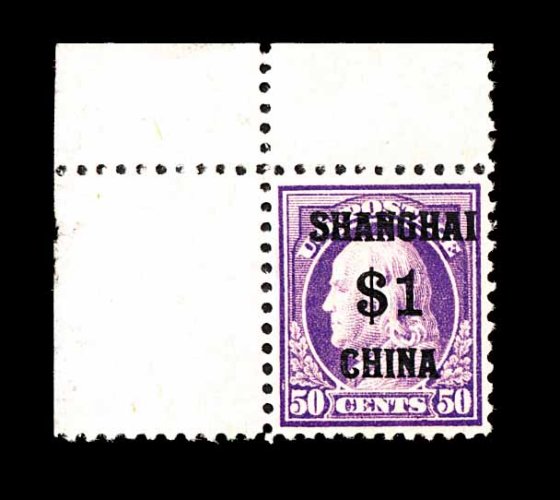 661 nh K15 image#K15, $1.00 on 50c Light violet, top left corner sheet-margin single, intense color, well centered, certificate states "never hinged with disturbed o.g.", very fine; 2001 PF certificate. (Image) 1,050.00