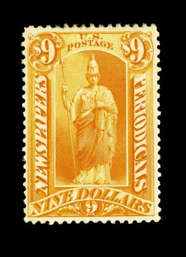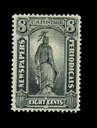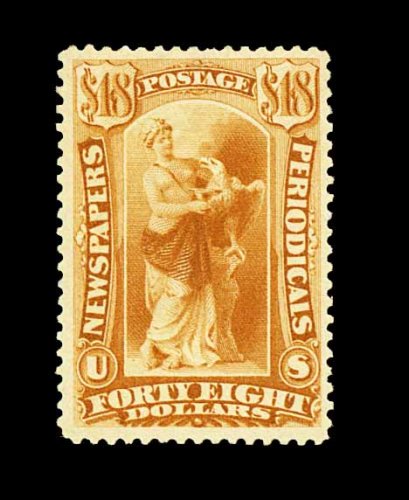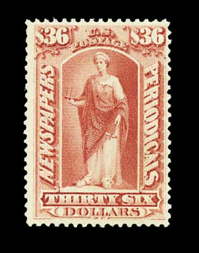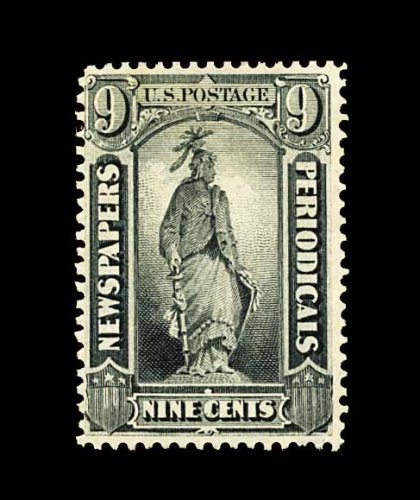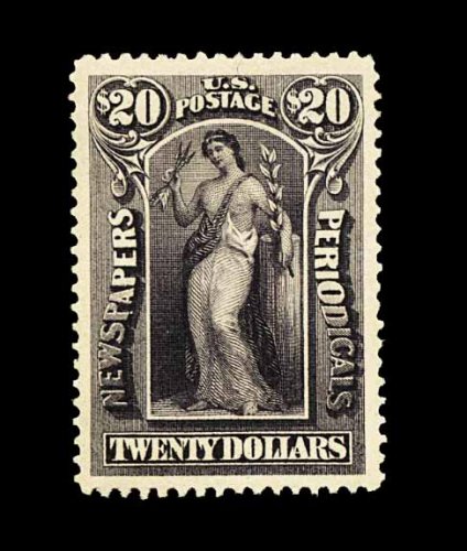 680 ng PR111 image#PR111, $20.00 Slate, a striking unused single of this rare newspaper stamp, being incredibly well centered within extraordinarily large and well balanced margins which are most uncharacteristic of this, sumptuously rich color and a razor-sharp impression on fresh paper, extremely fine; a lovely stamp; 2002 PF certificate. (Image) 1,650.00