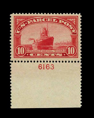 683 nh Q6 image#Q6, 10c Parcel Post, full bottom margin plate no. 6163 single, boasting absolutely enormous margins all around and being incredibly well centered within them, gorgeous rich luxuriant color, o.g., n.h., a couple of natural gum skips, an extremely fine and striking jumbo example; 1989 PSE certificate for a pair, this being the left stamp. (Image) 97.50