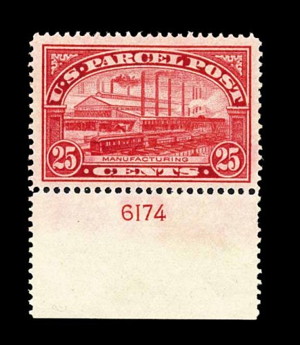 684 nh Q9 image#Q9, 25c Parcel Post, a highly desirable bottom margin plate no. 6174 single, featuring outstanding centering within lavishly large margins, intense vibrant color, o.g., n.h., extremely fine and choice; 1985 PF certificate. (Image) 125.00