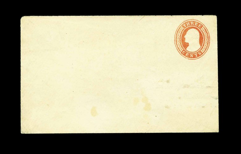 690 ogc U3 image#U3, 3c Red on white, die 2, size 7, knife 20, wmk. 1, unused entire, scuffs below indicia (probably from attempt to remove address), small backflap tears, fine appearance; a very rare entire which is missing from almost all collections (UPSS #5). (Image) 5,500.00