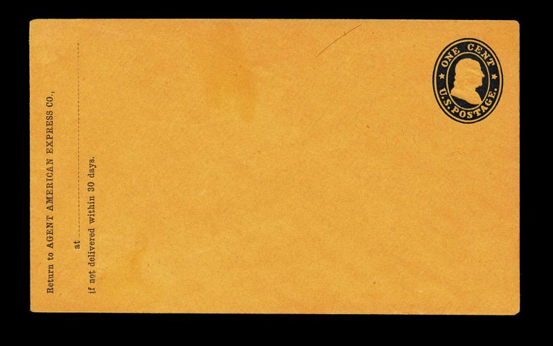 693 ogc U23 image#U23, 1c Blue on orange, star die, die 12A, size 7, knife 24, wmk. 1, mint entire with "American Express Co." printed return corner card at left as always, very fine (UPSS #43). (Image) 800.00