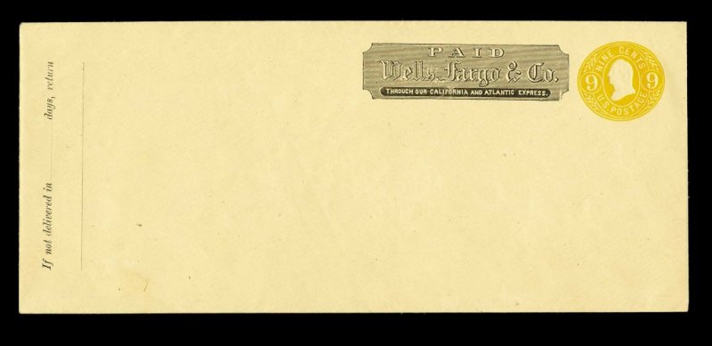 700 ogc U67 image#U67, 9c Orange on buff, die 28, size 21, knife 97, wmk. 1, large mint entire with Wells, Fargo & Co. printed frank, very fine (UPSS #136). (Image) 175.00