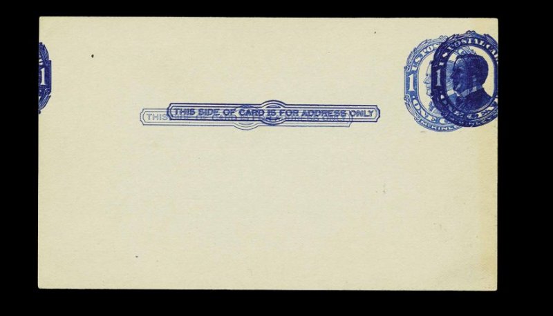 741 ogc UX22b image#UX22b, 1c Blue on bluish, triple impression, stunning mint card, showing three bold horizontal impressions, two are on top of each other, overlapping the third at right, fresh and bright with four crisp edges, extremely fine and rare; a highly desirable item that is unpriced in Scott and undervalued in USPC; ex-Beachboard (USPCC #S30c). (Image) USPCC 1,000.00+