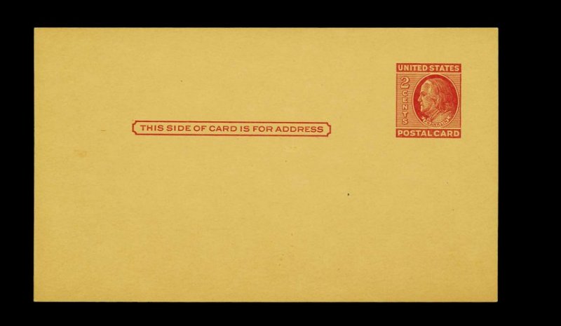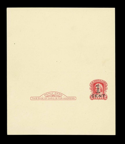747 ogc UY10 image#UY10, "1 cent" Press printed surcharge on 2c + 2c Red on buff, paid reply postal card, fresh mint folded example, very fine (USPCC #MR17). (Image) 325.00