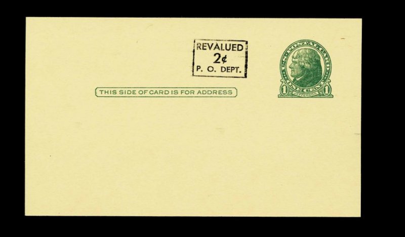 743 ogc UX39 var. image#UX39 var., 2c on 1c Green on buff, black surcharge error of color, fresh mint card, with a bold black surcharge in lieu of the normal light green, crisp stock with four sharp corners, extremely fine and rare; unlisted in Scott and unpriced with USPCC, as only two are known; ex-Beachboard (USPCC #S56-1a2). (Image) Est. 750-1,000
