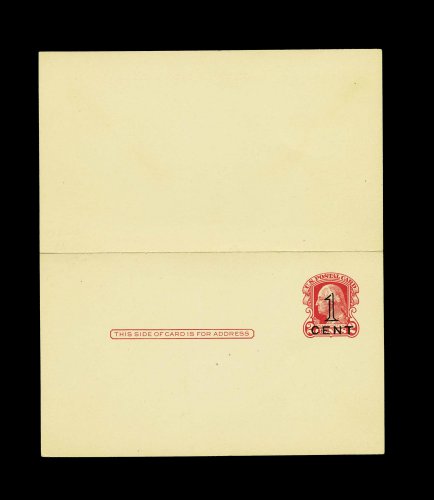 748 ogc UY10a image#UY10a, "1 cent" Press printed surcharge on 2c + 2c Red on buff, paid reply postal card, message card with no surcharge, a very rare mint unfolded example, 2c Washington message card bears no surcharge, truly "post office" fresh and choice, extremely fine; unpriced in both Scott and USPCC, only three examples are known mint unfolded; ex-Beachboard (USPCC #MR17b). (Image) Est. 1,000-1,500