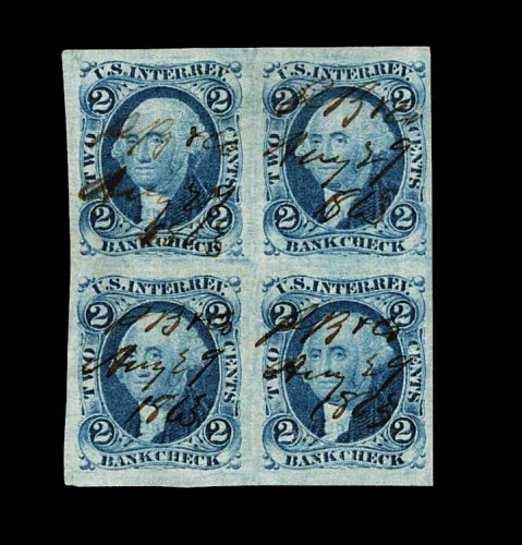 751 Obl R5a image#R5a, 2c Bank Check, imperforate, handsome used block of four, large to mostly huge margins all around, deep rich color, neat manuscript cancels, bottom right stamp with couple of pinholes, otherwise extremely fine; one of the most attractive used multiples available; ex-Zoellner. (Image) 150.00