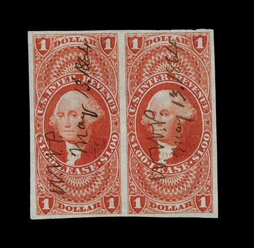 752 O R70a image#R70a, $1.00 Lease, imperforate, horizontal pair, well margined, bright rich color on fresh paper, neat 1864 manuscript cancels, tiny sealed tear at top of right stamp, otherwise very fine; ex-Joyce and Zoellner. (Image) 120.00