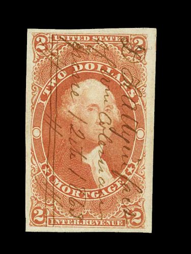 753 O R82a image#R82a, $2.00 Mortgage, imperforate, an eye-arresting used example which features absolutely immense margins all around, and each margin is especially well balanced, wonderfully fresh color and impression on bright paper, neat manuscript cancel, an extremely fine large-margined gem; 1999 PF certificate; ex-Lyons. (Image) 120.00