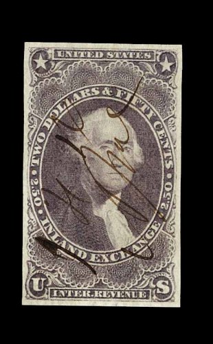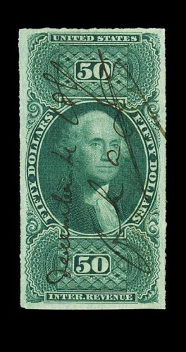 757 O R101a image#R101a, $50.00 U.S.I.R., imperforate, select used example, large even margins all around, deep rich color and impression on fresh paper, neat manuscript cancel, extremely fine; not often seen this nice. (Image) 200.00
