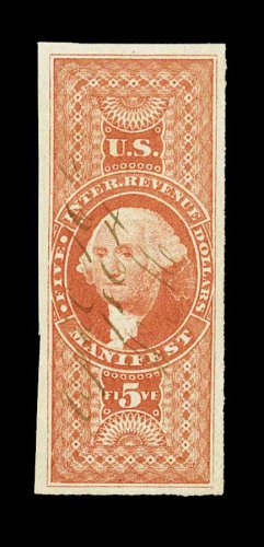 755 O R90a image#R90a, $5.00 Manifest, imperforate, extraordinary quality used example, with huge margins all around which are especially well balanced, bright color and strong impression, light and neat manuscript cancel, an extremely fine gem; 1997 PF certificate. (Image) 120.00