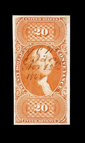 756 O R98a image#R98a, $20.00 Conveyance, imperforate, wonderfully bright and fresh used example, with lovely vibrant color and a crisp impression, large to huge margins all around, neat manuscript cancel dated 1863, extremely fine; an eye-arresting used gem; 1999 PF certificate; ex-Lyons. (Image) 125.00