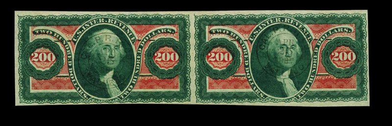 758 O R102a image#R102a, $200.00 U.S.I.R., imperforate, a handsome appearing used horizontal pair of this rarity, being one of only three recorded horizontal pairs according to the Curtis census, full to large margins all around, spectacularly fresh and bright, with intense colors and impressions, each stamp with a light central strike of "Cal. P.R.R. Co./Vallejo/Apr 25,1867" circular handstamps, left stamp with trivial light crease, still very fine and highly select; 2001 PF certificate; ex-Col. Green. (Image) 3,250.00