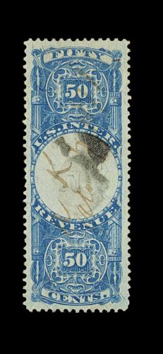 759 O R115b image#R115b, 50c Blue and black, Inverted Center, a magnificent quality used example, featuring outstanding centering amid the most lavish margins we have ever seen on this rare invert, plus its colors are far more rich than usual and its impressions strong, very light and unobtrusive manuscript cancel, extremely fine; gem examples of any of the Inverted Centers are truly rare and highly desirable as so few exist; 1998 PF certificate. (Image) 850.00