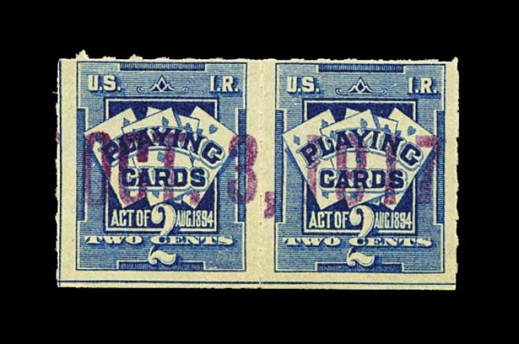 763 og RF5 var. image#RF5 var., (7c) on 2c Ultramarine, handstamped "Oct. 3, 1917" across horizontal pair, a very scarce mint example of this Los Angeles surcharge, quite fresh, o.g., lightly hinged, fine; especially desirable showing complete surcharge spanning across both stamps; 1999 PF certificate. (Image) 1,500.00+