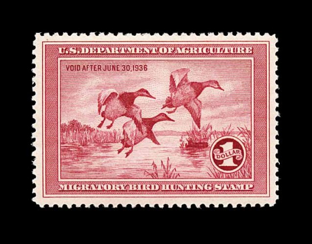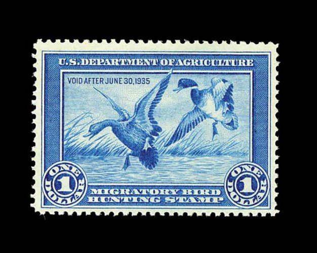 767 nh RW1 image#RW1, 1934 $1.00 Blue, well centered within unusually large margins, strong rich color, o.g. without any of the usual gum bends or skips, n.h., choice very fine; photocopy of a 2000 PF certificate for a block of four, this being the top left stamp. (Image) 750.00
